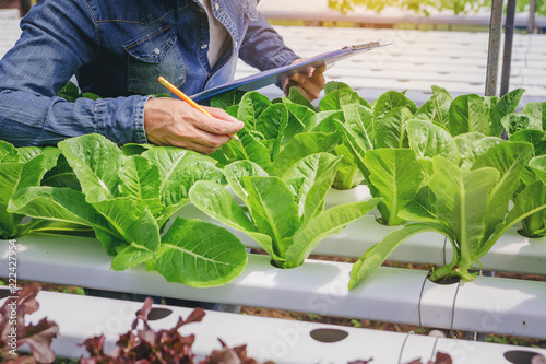 Farmer Owner Hydroponics Vegetable Farm In The Greenhouse Make A Short Note For Care And Make Order The Organic Vegetables Close Up Shot Buy This Stock Photo And Explore Similar Images