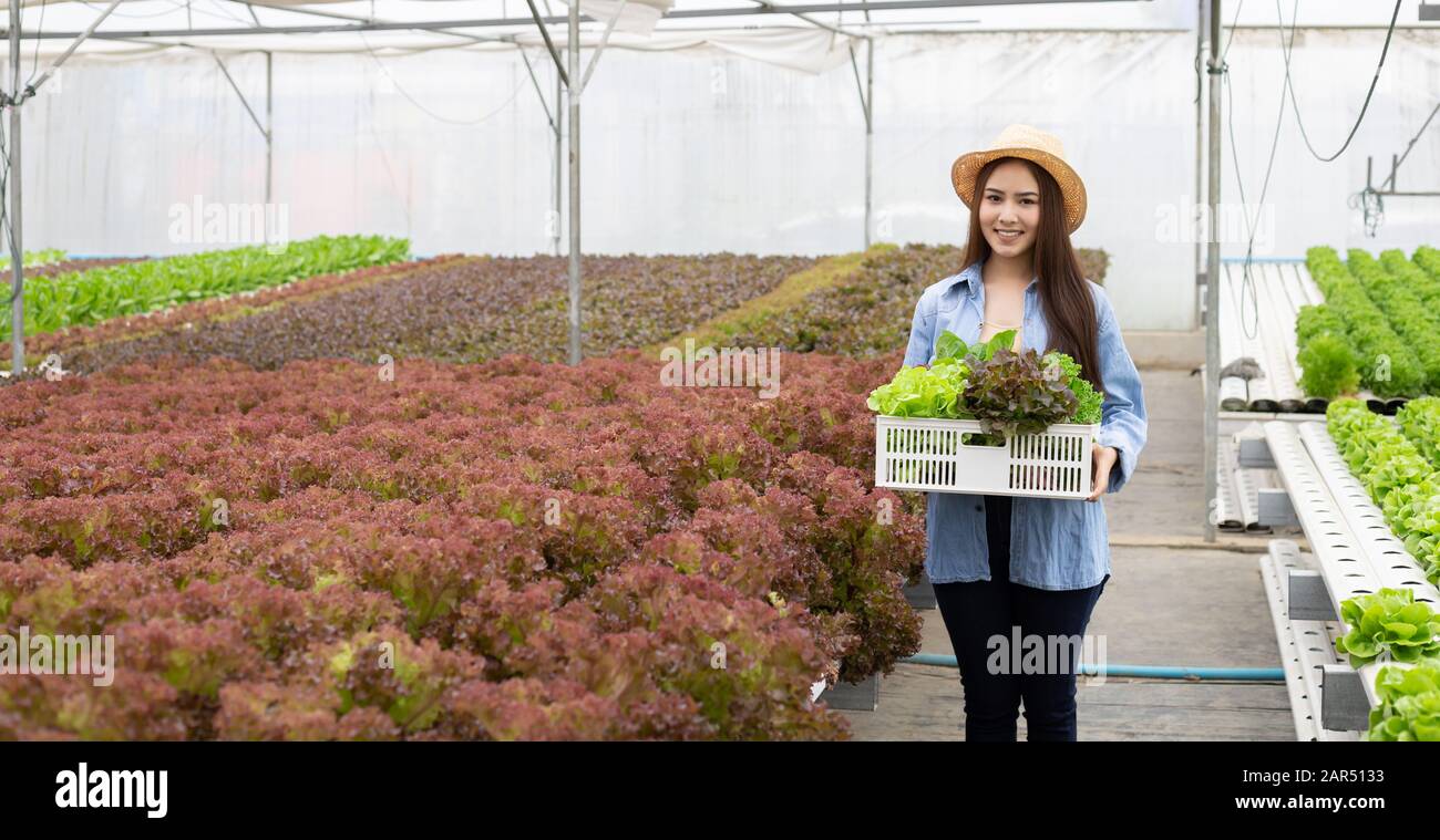 Happy Asian Female Farmer Holding A Basket Of Organic Vegetables After The Harvest In Hydroponic Farm With Smile Organic Vegetables From Farms That A Stock Photo Alamy