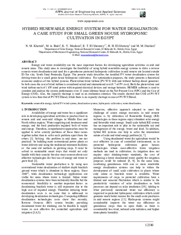 Pdf Hybrid Renewable Energy System For Water Desalination A Case Study For Small Green House Hydroponic Cultivation In Egypt Karam Maalawi Academia Edu