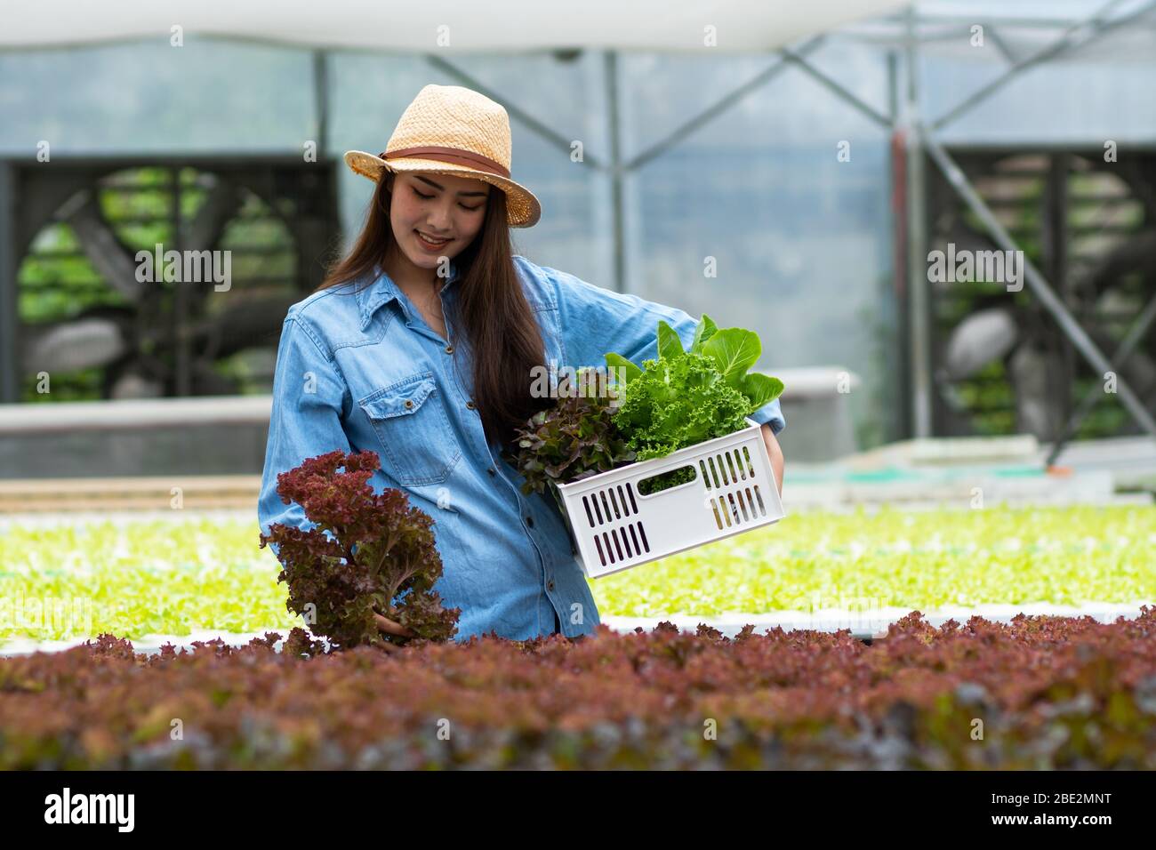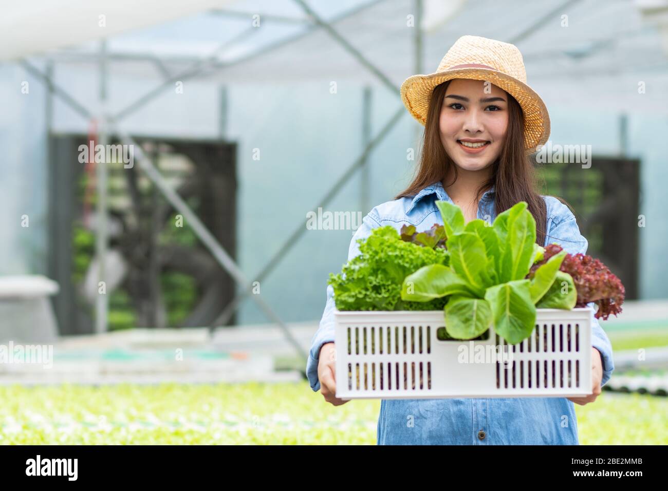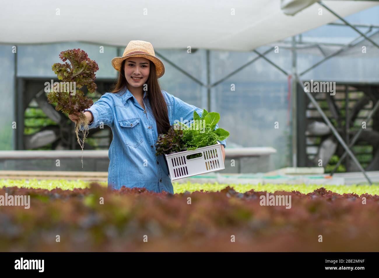 Beautiful Healthy Woman Holding Salad Vegetables In Hydroponics